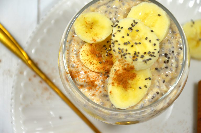 - Snijd de banaan in plakjes en leg als topping op het mengsel