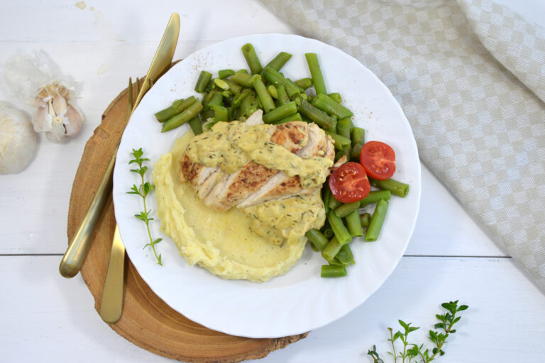 - Verwarm de aardappelpuree volgens de aanwijzingen op de verpakking