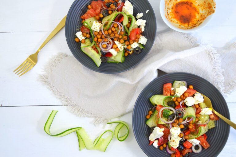 - Top de salade af met de geroosterde kikkererwten en 100 gram witte kaas blokjes. Hussel goed door.