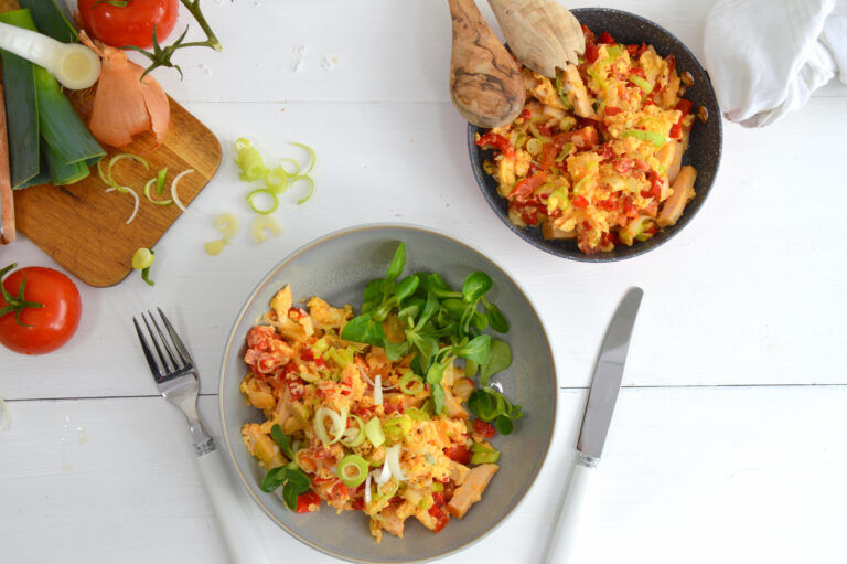 - Verhit 1 eetlepel olijfolie in een koekenpan, bak hierin de prei, paprika, tomaten, ui en kipreepjes voor 5 minuten.
