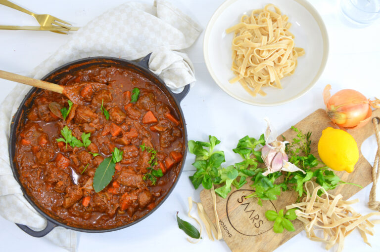 - Verdeel de stoof en de tagliatelle over 3 borden, top eventueel af met wat rauwkost!