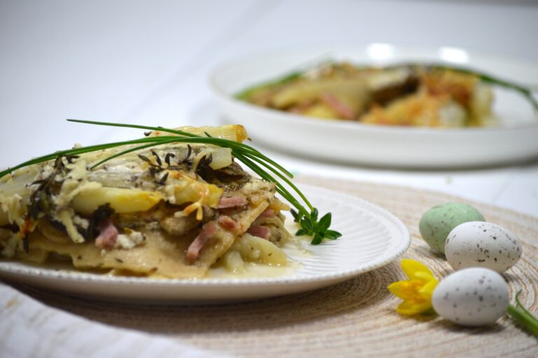 - Halveer de lasagnebladen. Vet een ovenschaal (20×15) in en bouw de lasagne op met saus, lasagnebladen (3 halve) champignons, hamblokjes en asperges. Herhaal en eindig met asperges, saus, kaas en verse kruiden.