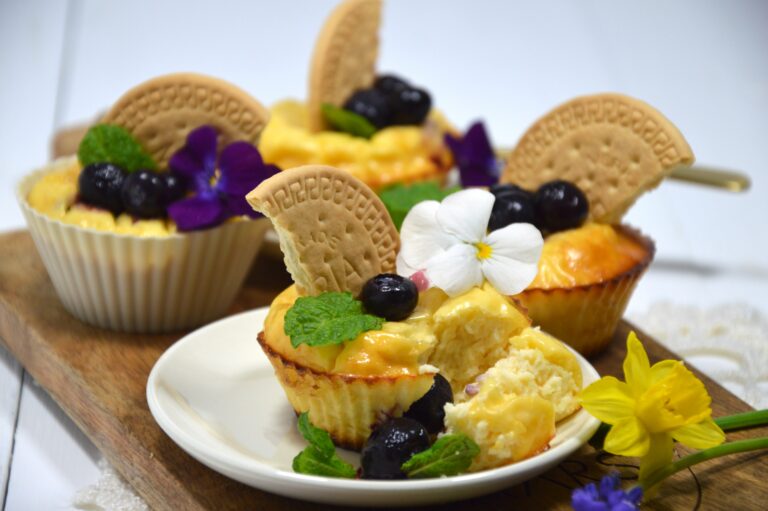 - Serveer ze eventueel lauwwarm met een half Maria biscuitje, blauwe bessen en een blaadje munt.