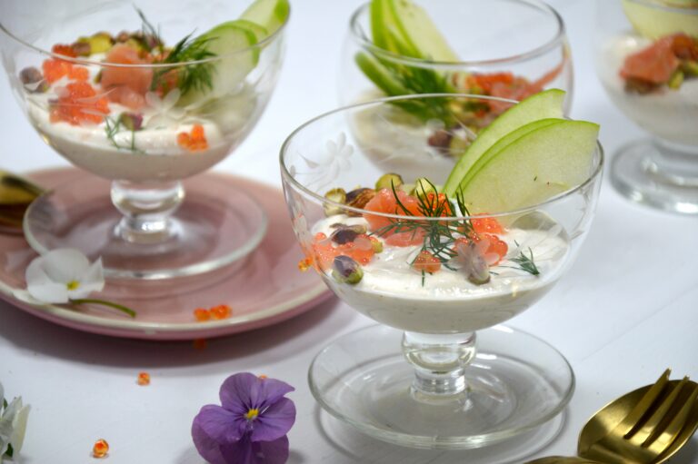 - Verdeel de mousse over vier glaasjes, steek de aspergetopjes erin en garneer met dille, appelschijfjes, zalmforel eitjes en pistachenoten.