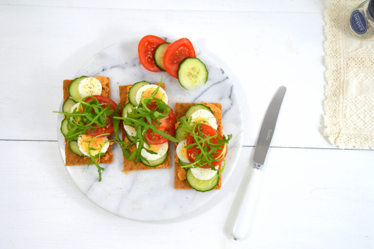 - Verdeel het ei, de tomaat en komkommer over de crackers. Eet de overige rauwkost als snackgroente bij je lunch