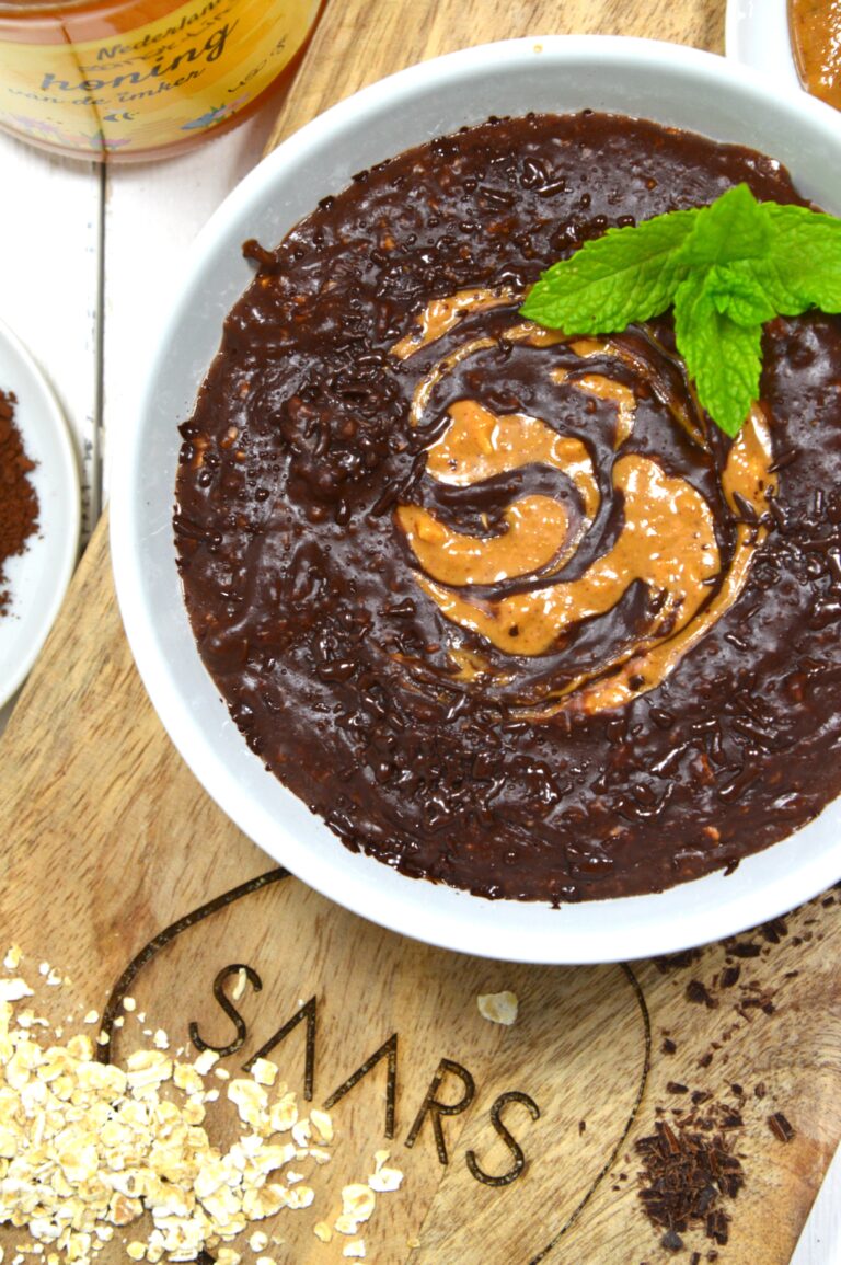- Voeg de pindakaas, honing en de cacao toe en laat 2-3 minuten zachtjes koken.